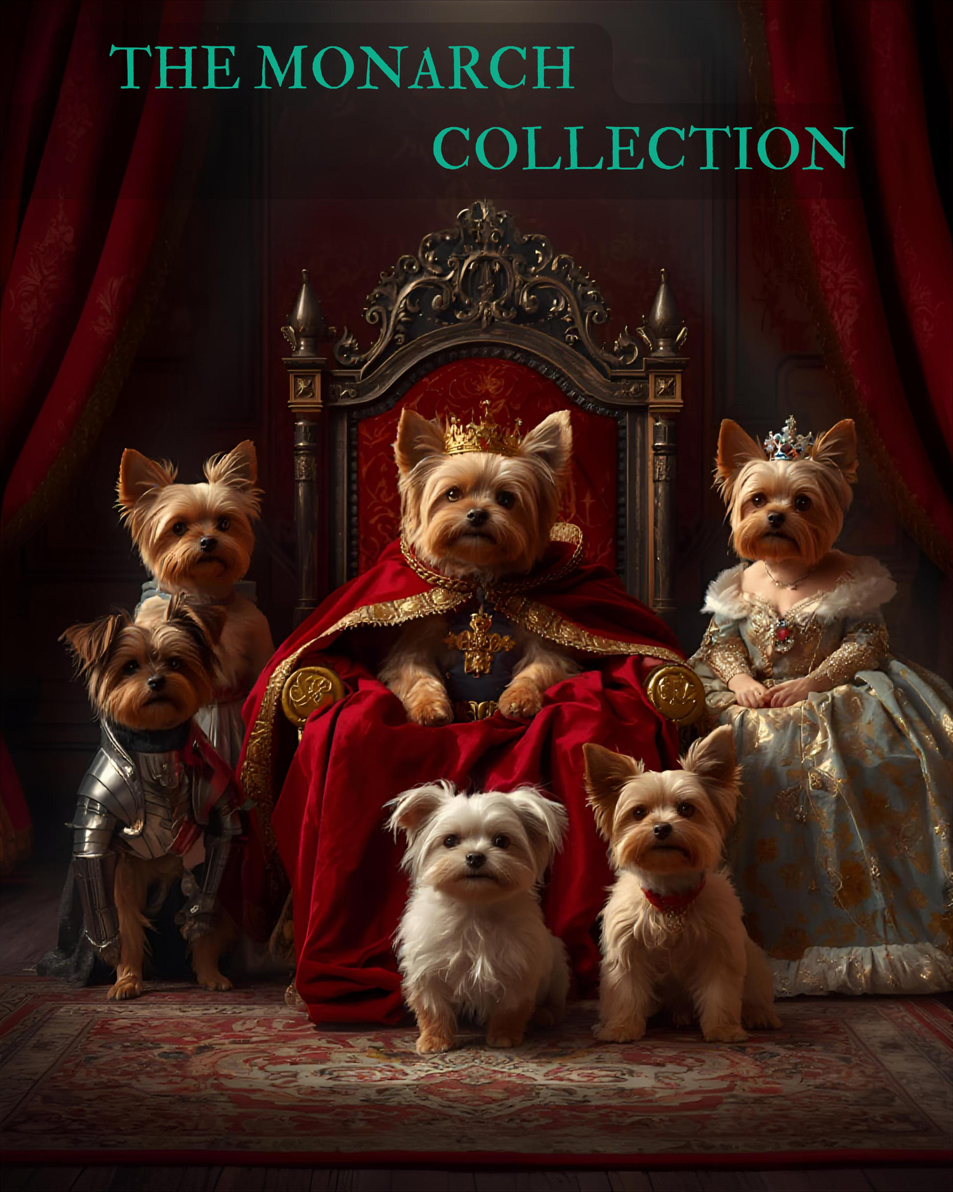 Elevate your pet's legacy to regal heights with the Monarch Collection. A luxurious line inspired by the dramatic, secretive world of a royal Yorkie family, where every glance holds intrigue and every tail wag whispers scandal.